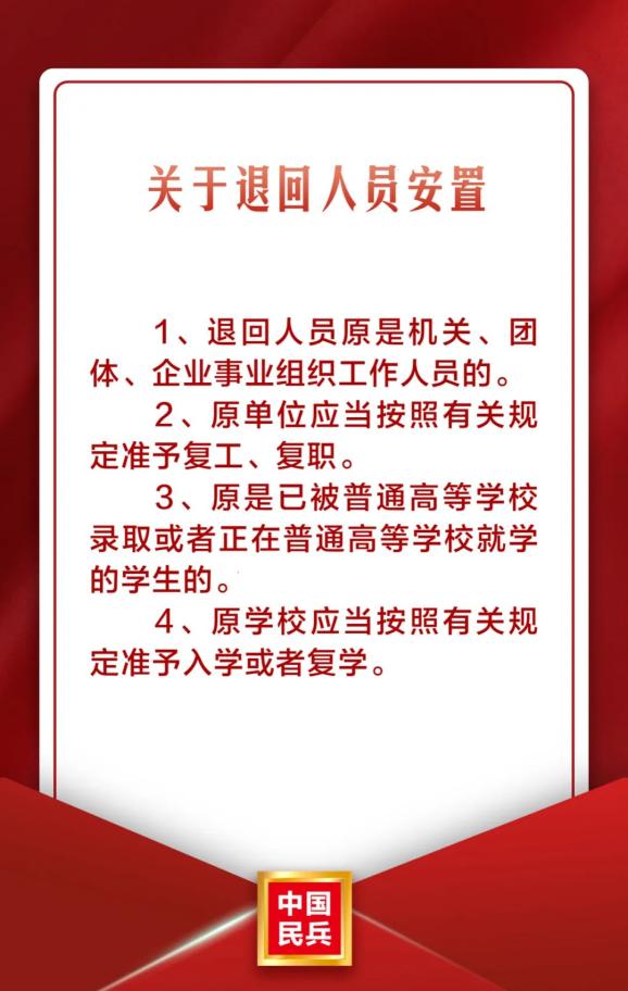 退回人员安置第五十五条 退回人员原是机关、团体、企业事业组织工作人员的,原单位应当按照有关规定准予复工、复职;原是已被普通高等学校录取或者正在普通高等学校就学的学生的,原学校应当按照有关规定准予入学或者复学。