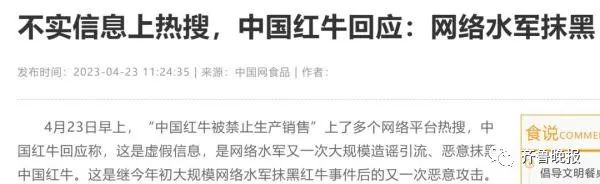 中国红牛回应:造谣抹黑对此,中国红牛回应称,这是网络水军大规模造谣引流、抹黑中国红牛。