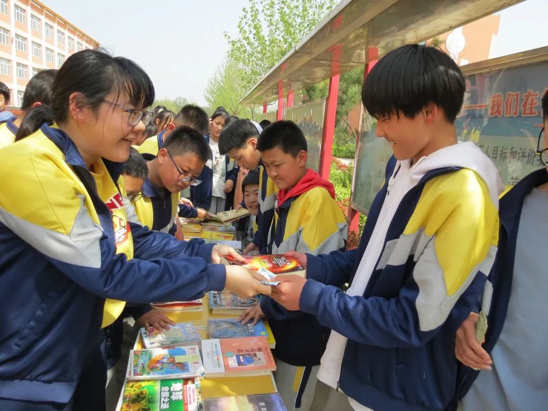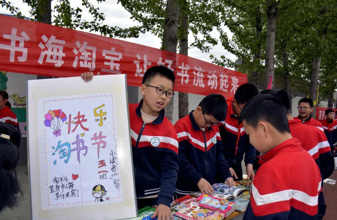 ▲诸城市百尺河初级中学举行了以“淘书会友 共享阅读”为主题的校园读书节活动。