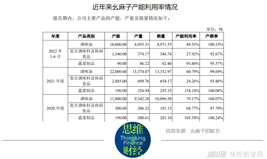 2019年至2022年上半年,幺麻子调味油的产能利用率分别为110.43%、79.17%、60.79%和49.55%;同期公司复合调味料及休闲食品产能利用率分别为71.29%、68.77%、24.26%和27.92%;同期公司蔬菜制品产能利用率分别为132.28%、105.58%、134.18%和95.80%。