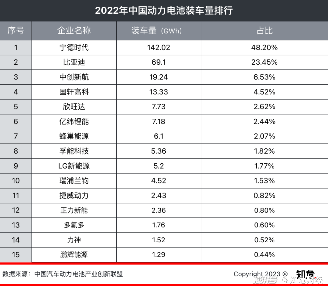 2022 年,宁德时代的动力电池市场率为 48.20%,较 2021 年下降了 3.9 个百分点。与此同时,因为旗下新能源汽车销量达到 186 万辆,同比暴增 208.64%,比亚迪电池的市占率同比增加了 7.2 个百分点,达到 23.45% 。