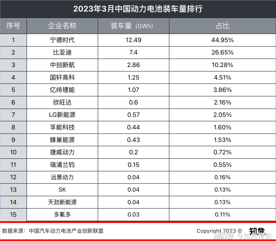 到了今年三月,宁德时代的市场占有率继续下滑到了 44.95% 。