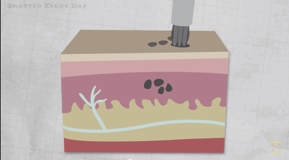 当油墨颗粒进入皮肤,我们的免疫系统会将其视为外来入侵者,所以会派出巨噬细胞来吞噬它们。© Smarter Every Day法国国立马赛吕米尼免疫中心的免疫学家桑德里娜·亨利(Sandrine Henri)和同事已经发现巨噬细胞对于墨水的“喜爱程度”可以帮助解释为什么文身图案如此“坚韧”,甚至在巨噬细胞死后依旧不改原貌。巨噬细胞的寿命只有几天或几周,在最后的日子中,它开始裂解,释放内部的色素颗粒。但墨水立刻被附近的另一个巨噬细胞夺走吞下,这个细胞或多或少能够承担后继者的功能,它距离原来的细胞不到几微米——还不到人类一根头发那么粗。