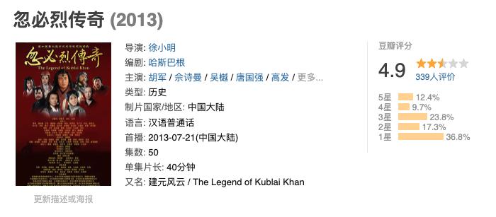 第一部电视剧《忽必烈传奇》,豆瓣评分4.9,打分的观众仅仅只有339人。