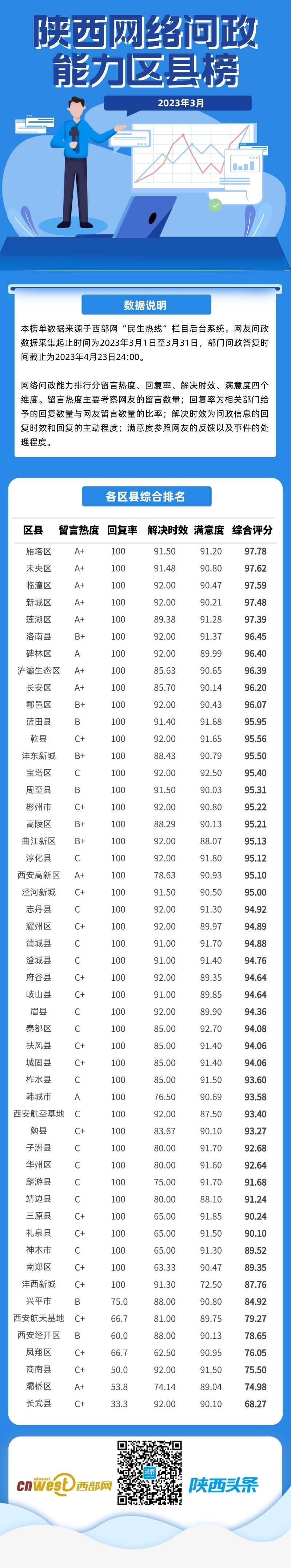 2023年3月,西部网“民生热线”栏目与陕西51个区县(开发区)进行了网络问政沟通对接。根据各区县(开发区)留言热度、回复情况和网友满意度的综合评定,西安雁塔区、西安未央区、西安临潼区分别以总分97.78、97.62、97.59位列网络问政能力3月区县榜前三名。44个区县有问必答 回复率100%