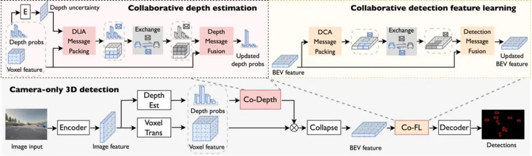 图 2. CoCa3D 整体系统框图。协作深度估计(Collaborative depth estimation)和协作检测特征学习(Collaborative detection feature learning)是两大关键模块
