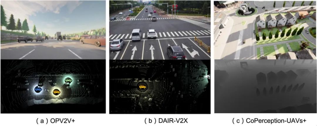 图 4. 数据集 CoPerception-UAVs+、DAIR-V2X 和 OPV2V + 样本可视化