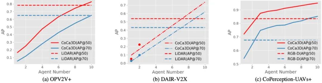 研究者发现,CoCa3D(实线)在 10 个相机的协作下在 OPV2V+ 上的 AP@0.5/0.7 都优于 LiDAR 3D 检测!由于真实车路协同数据集 DAIR-V2X 仅有 2 个协作相机,我们使用 OPV2V + 的斜率来拟合真实车路协同数据集上的检测性能与协作相机个数的函数,发现在实际场景中,仅 7 个协作相机即可实现优于 LiDAR 3D 检测的效果!此外,随着协作代理数量的增加,检测性能的稳步提高鼓励协作者积极协作并实现持续改进。