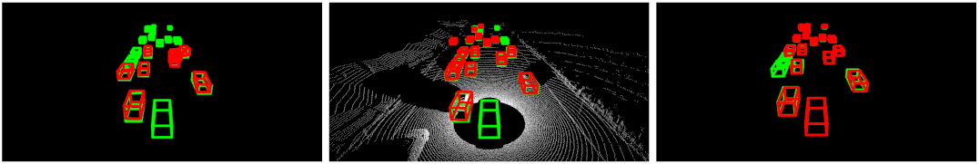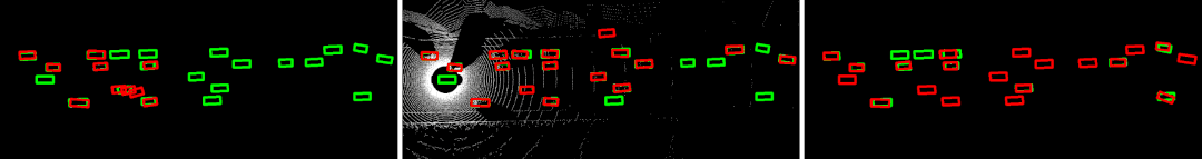 图 6. 3D 检测结果 3D 视角和 BEV 视角可视化(红框为检测框,绿框为真值)。(a) 单个相机检测效果可视化,(b) 激光雷达检测效果可视化,(c) 协作相机检测效果可视化。