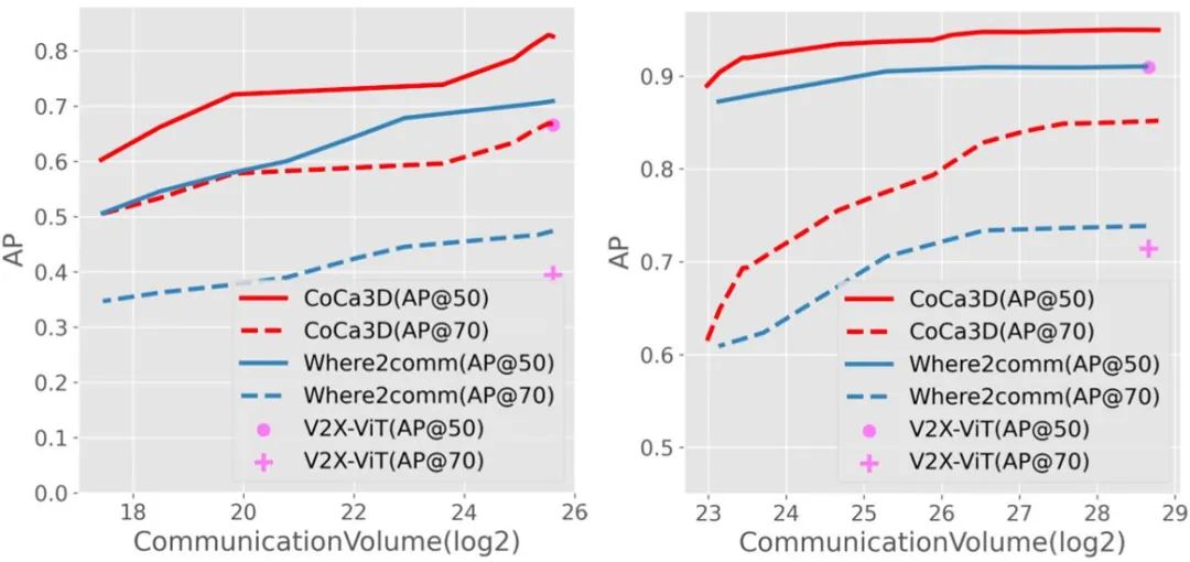 值得注意的是,相比之前的基线方法 V2X-ViT(ECCV 22),针对某个特定通信量进行了有针对性的模型训练,因此在通信量 - 探测效果的图中是一个单点。而 CoCa3D 可以自动调整和适应各个通信量,因此是一条曲线。由此可见,CoCa3D 实现了感知效果与通信消耗的有效权衡,能自适应资源多变的通信环境,且在各种通信条件下均取得了优于基线方法 Where2comm(NeurIPS 22)的感知效果。
