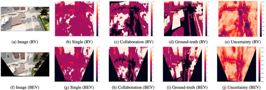 研究者发现:i)单个视角下深度估计可以估计相对深度,但无法精确地定位深度绝对位置,例如,车辆比其所在的平面更高,但这个平面没有正确分类;ii)通过协作的深度信息分享,引入多视图几何,协作估计的深度可以平稳而准确地定位平面;iii)对于远距离和背景区域,深度的不确定性较大。原因是远处的区域很难定位,因为它们占用的图像像素太少,而背景区域由于没有纹理表面而难以定位。