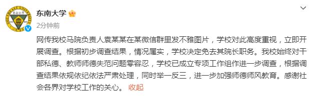 24日,东南大学官方微博就该校马院负责人袁某某在某微信群里发不雅图片一事进行回应。
