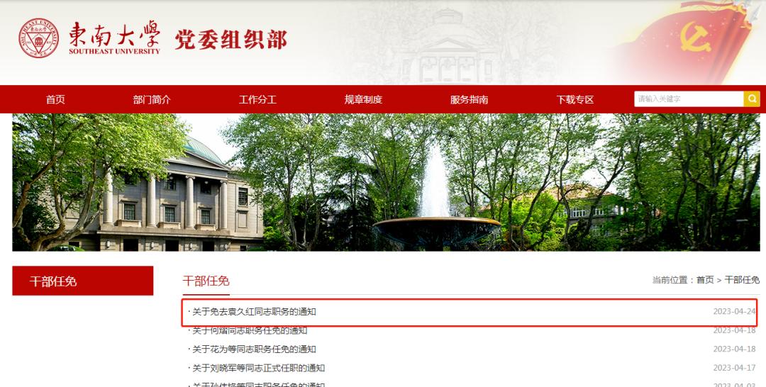 此前,东南大学党委组织部官网也发布了“《免去袁久红同志职务的通知》。