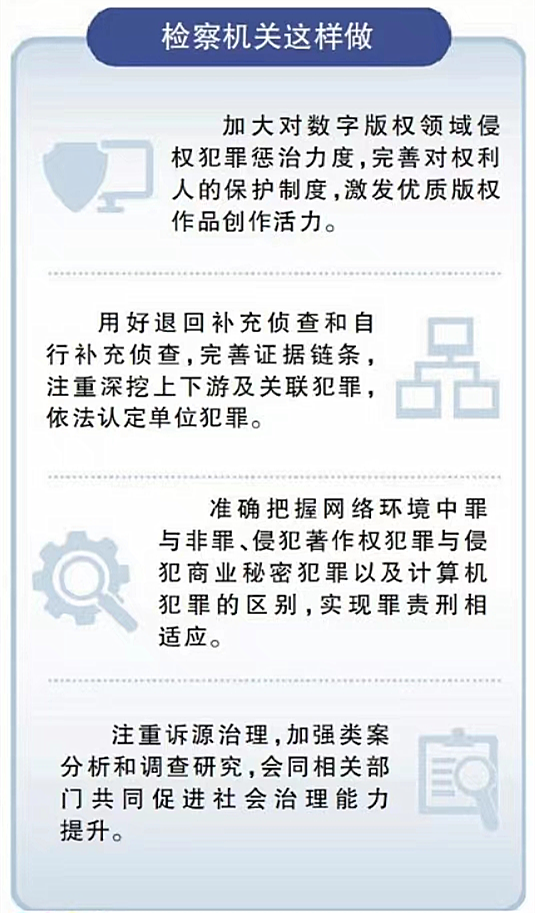 最高检知识产权检察办公室负责人谈道:“全国检察机关在办理涉数字版权案件时,一要提高政治站位,从服务文化繁荣、促进创新发展的高度,充分履行职能,加大对数字版权领域侵权犯罪惩治力度,完善对权利人的保护制度,激发优质版权作品创作活力;二是要坚持全链条打击,加强与公安机关、行政机关协作配合,用好退回补充侦查和自行补充侦查,完善证据链条,注重深挖上下游及关联犯罪,依法认定单位犯罪;三要适应网络版权案件特点,综合侵权行为手段、对象、目的、危害后果等各种因素,准确把握网络环境中罪与非罪、侵犯著作权犯罪与侵犯商业秘密犯罪以及计算机犯罪的区别,实现罪责刑相适应;四是要注重诉源治理,以个案办理为基础,加强类案分析和调查研究,保持对新情况新问题的敏感度,善于透过现象看本质,对于发现的网络环境中存在的社会治理问题,及时提出意见建议,会同相关部门共同促进社会治理能力提升。”