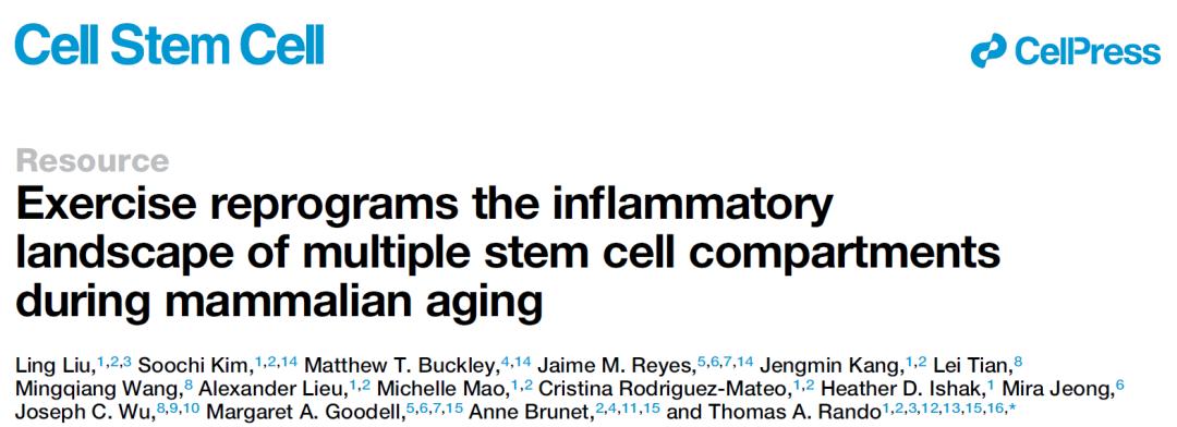 近日,斯坦福大学医学院的研究人员在 Cell Stem Cell 期刊发表了题为:Exercise reprograms the inflammatory landscape of multiple stem cell compartments during mammalian aging 的研究论文。