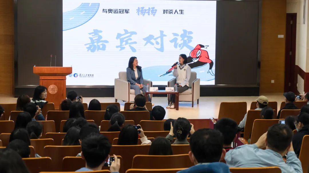 ▲杨扬和讲座主持人、新闻学院硕士生章誉倬杨扬来自于黑龙江的一个小县城。讲座伊始,谈起学习滑冰的契机,她脱口而出:“滑冰应该是我当时唯一的运动,没有太多其他选择,被体校老师选上就去了”。