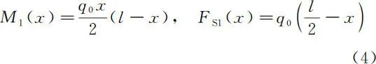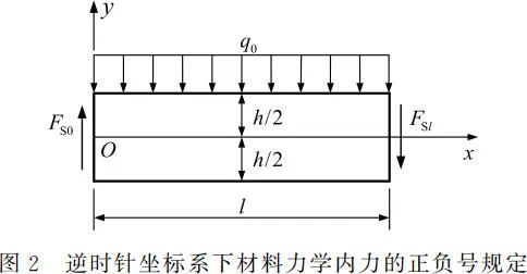 然而,材料力学关于内力和杆端外力的主矢量及主矩的正负号规定,未能与坐标系联系起来,因而不能反映数学逻辑关系,这为材料力学后续学习带来一定的不便。例如,在研究梁弯曲的位移时,由于挠度、转角以及曲率均与坐标系有关,其正负号是在给定的坐标系下规定的。为了清晰地阐明这一点,以材料力学中矩形截面简支梁受均布荷载 q0 的弯曲为例,其中取梁的截面宽度 b=1,忽略梁的自重。现去掉支座而直接用支反力代替,对于图 1 和图 2 所示的两种坐标系,按照材料力学中内力和杆端外力的主矢量及主矩的正负号规定来分析,其中梁两端的剪力均已按正向来表示。