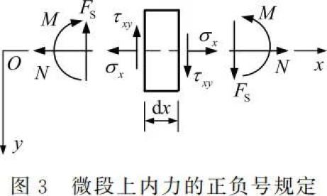 对于内力主矢量及主矩的正负号规定,以平面问题为例,如图 3 所示,轴力 N、剪力 FS 和弯矩 M 的正负号规定是从应力分量的正负号规定得出的,即:轴力 N 以截面上产生正号的正应力 σx 时为正,反之为负;剪力 FS 以截面上产生正号的切应力