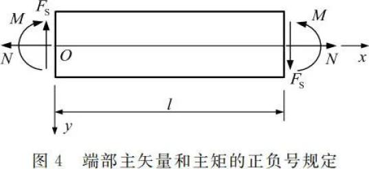为正,反之为负;弯矩 M 以截面上 y > 0 的一侧产生正号的正应力 σx 为正,反之为负。同时,根据应力分量定义的内力主矢量及主矩的正负号,可以方便地延伸到端部边界上的已知主矢量和主矩的正负号规定,如图 4 所示。这样,就实现了微段与端部的主矢量和主矩正负号的统一规定,即实现内力与外力正负号的统一规定。
