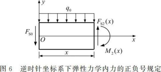 可见,按照弹性力学来定义内力和杆端外力主矢量及主矩的正负号,就能保证弹性力学正确解答中完整地体现材料力学的基本解答,且在形式上具有一致性。顺便指出,如果按照材料力学来定义内力和杆端外力主矢量及主矩的正负号,对于图 2 所示的梁弯曲问题,其切应力的弹性力学正确解答将与材料力学基本解答不完全相同,它们之间相差一个负号。