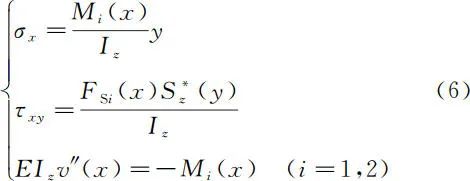 其中,Iz 为横截面对中性轴 z 的惯性矩,为横截面上距中性轴为 y 的横线以外部分的面积对中性轴 z 的静距,E 为材料的弹性模量,v(x) 为横截面的挠度。