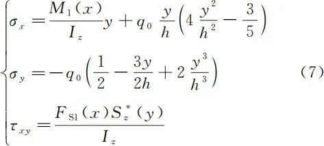 于是,将式(4)代入式(6)中,即可得到图 1 坐标系下梁弯曲的正应力 σx 和切应力。同样,将式(5)代入式(6)中,即可得到图 2 所示问题的正应力 σx 和切应力
