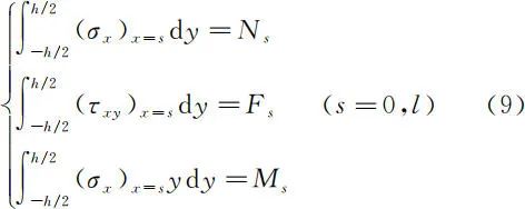 在应用圣维南原理时,需要将小边界上的精确应力边界条件(函数方程)替换为用主矢量和主矩表示的积分应力边界条件(代数方程)。当小边界面为坐标面时,直接利用静力等效方法来建立其积分的应力边界条件是十分方便的[5]。此时,在小边界上应用圣维南原理,可以直接地表述为:在同一小边界面上,应力的主矢量和主矩分别等于外力(面力)的主矢量和主矩[6]。例如,对于图 7 所示的平面问题,在小边界 x = 0 和 x = l 上,其积分的应力边界条件可以统一写为