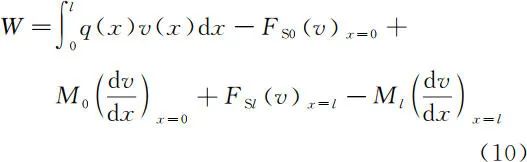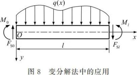 在弹性力学变分解法中,往往需要计算外力功,引入主矢量及主矩正负号的统一规定,可以直观、便捷地判断外力功的正负号。例如,图 8 所示坐标系下的等截面直梁,在梁的上表面作用有分布荷载 q(x),在梁的端面上作用有适当的剪力和弯矩(均按正方向标出),使梁保持平衡,其中 v(x) 为梁轴线的挠度。现在,用梁的挠度 v(x) 来表示外力功,由于挠度 v(x) 与 y 轴正向一致时为正,转角以 x 轴正向转向 y 轴正向时为正,因此外荷载所做的功即为