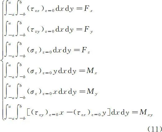 3.4 空间问题圣维南原理中的应用对于空间问题,在小边界上应用圣维南原理时,其积分的应力边界条件是 6 个。为了方便起见,假定在小边界上的外力已经事先按照静力等效原则移置到坐标原点处。例如,在图 11 所示的坐标系中,在小边界 z = 0 上作用有主矢量 Fx、Fy、Fz 和主矩 Mx、My、Mxy,应用圣维南原理建立积分的应力边界条件为
