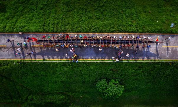 冯彦敏 摄随后,“扒丁”们用杉木和麻绳固定几十米长的船身。“一二三!一二三!” “扒丁”们喊着号子,肩扛龙舟,齐心协力将重达2吨的龙舟抬上岸。
