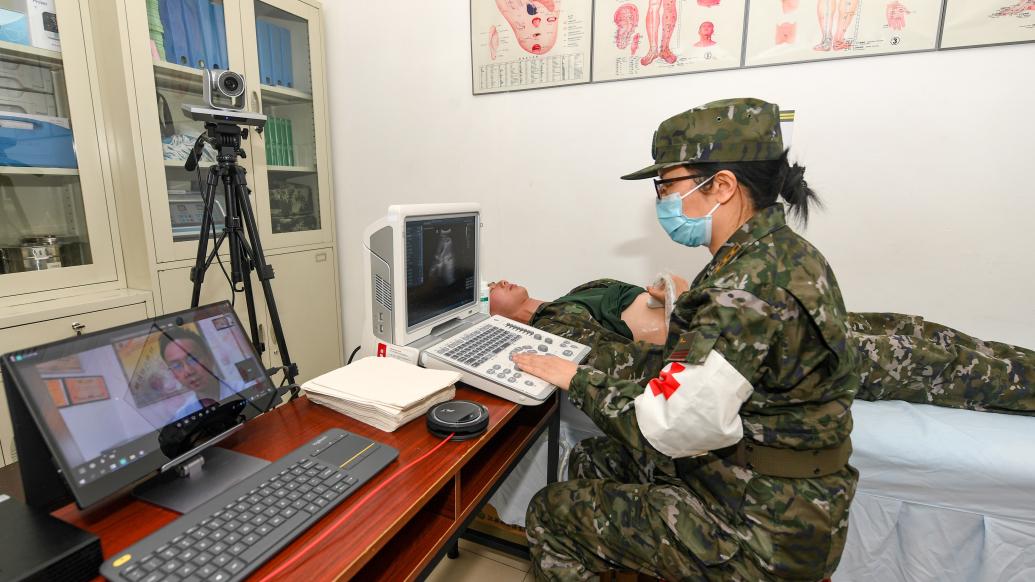 军地专家正在利用5G超声远程诊疗系统为基层官兵会诊。 王春阳 摄