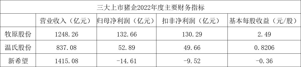 三大上市猪企2022年度主要财务指标。澎湃新闻制图