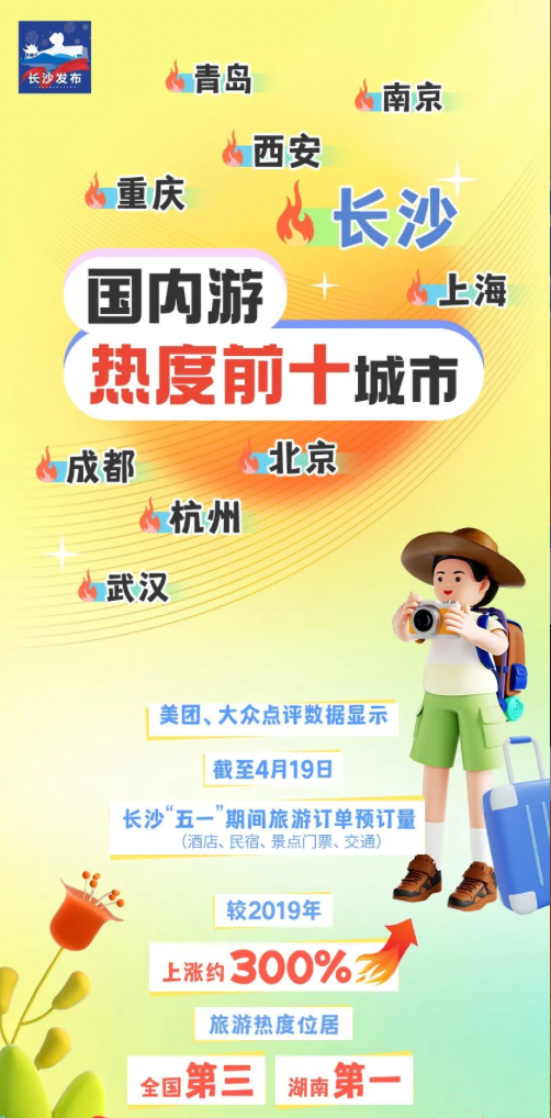 长沙“五一”期间旅游订单预订量(酒店、民宿、景点门票、交通)较2019年上涨约300%,旅游热度位居全国第三。