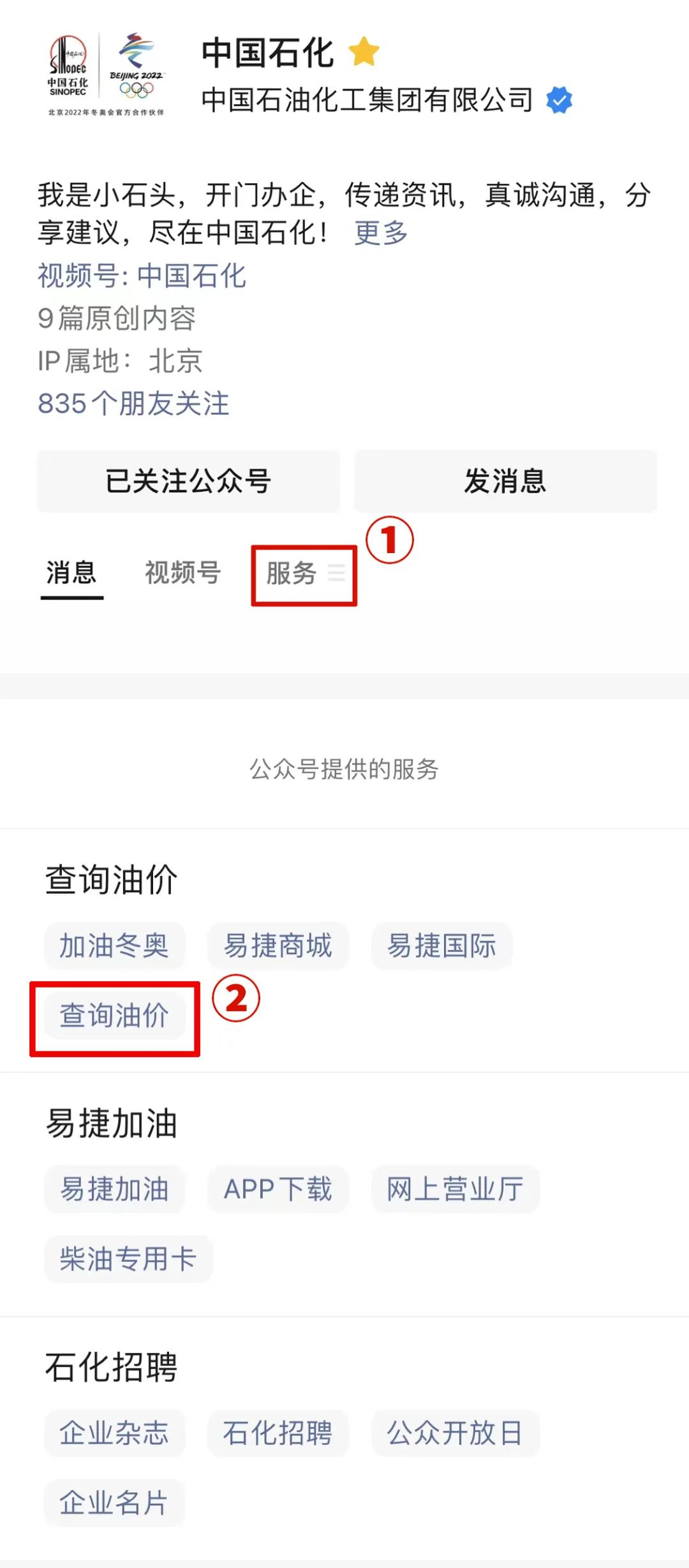进入中国石化公众号主页点击“服务”→“查询油价”
