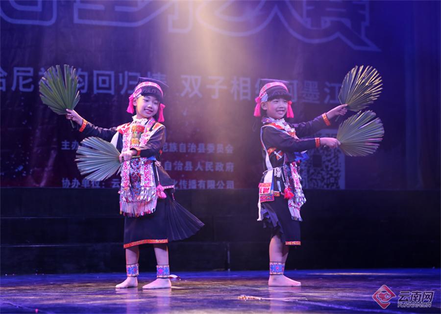 运动场:“哈尼神韵回归情、双子相约阿墨江”联欢晚会。