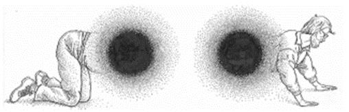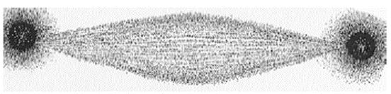时间机器自毁:当右边的虫洞在其孪生子佯谬之旅结束时飞回左边,真空涨落就流过虫洞,然后通过虫洞之间的空间流出,在它们离开的同时回到了它们的出发点。它们的引力能量变得非常大,也许在虫洞变成时间机器的那一刻就摧毁了它。(图改编自我的书《黑洞与时间扭曲》,[4].当被带出的洞口回到地球时,虫洞可以首次实现回到过去的功能。一个实体进入一个洞口,在它进入之前它就从另一个洞口退出,然后以尽可能高的速度,也就是光速,飞跃宇宙回到它的起点,在它开始旅行的那一刻就回到了第一个洞口,这是时间倒流能做到的第一件事,在离开前就碰到了自己。即使没有光或其他光速放射线在这条往返时间旅行路线上传播,真空涨落也总是会这样做。它们是不可阻挡的。在它们离开的那一刻回到起点时,真空涨落会堆积在它们年轻的自己身上。结果是复制每个波动,然后再来回另一次,每个波动就变成了原来的四倍,依此类推。根据我在1990年与博士后金成元(Sung-Won Kim)所做的计算,底线是恰好在时间旅行首次可能的时刻——即在时间机器激活的那一刻,在虫洞中的引力波动能量的一个爆炸性流 [4]。