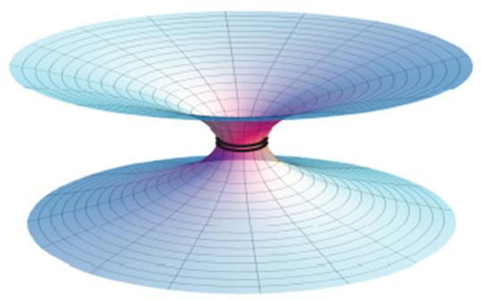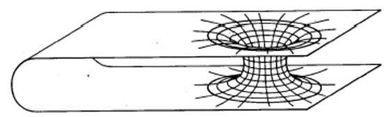 从高维超空间观察的虫洞。我们的宇宙是二维的薄片。虫洞是从我们薄片中的一个位置(我们的宇宙)到薄片中另一个位置的超时空捷径。现在,假设一个来自极其先进文明的生物在“孪生子佯谬”之旅中将足球场虫洞口带到宇宙里。当那个洞口回来时,它可能只老化了一秒钟,而我办公室里的虫洞洞口却老化了一天。于是虫洞变成了一台时间机器:如果我进入一个洞口,只穿过几秒钟,我就会在下一天从另一个洞口里出来。而从另一个方向穿越虫洞,我会从前一天出来!(参见 [4].)
