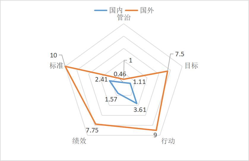 以下为国内外企业从管治、目标、行动、绩效、标准这5个维度的平均得分雷达图,可以看出国外各维度披露情况都比国内得好。对于国内,行动维度披露得最好,但各维度国内电力企业总体披露程度都不太高;对于国外,标准,行动,绩效,目标维度披露得较为充分,但管治维度的披露有待加强。