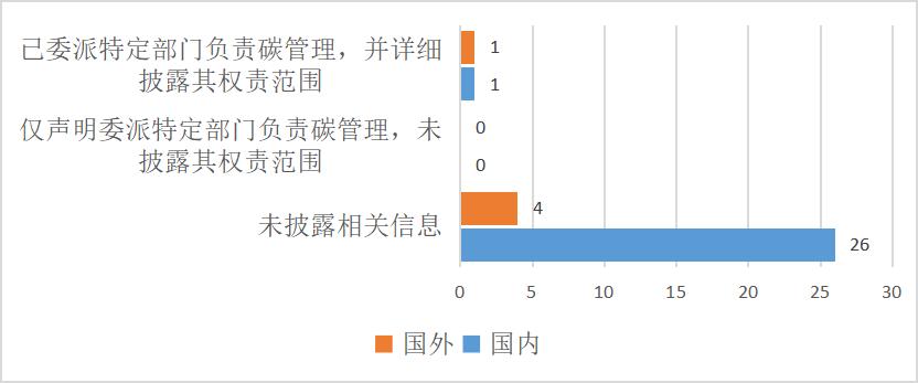 在国内,只有电能实业(股票代码:00006)一家企业的可持续发展报告中提到其已委派特定部门负责碳管理,并详细披露其权责范围:董事局设立可持续发展委员会,其可持续发展管理委员会由行政总裁、一名执行董事、财务总监、集团法律顾问及公司秘书,以及数名集团高级管理层成员组成,负责处理可持续发展的各项事宜和政策,推动集团的相关策略措施,在环境方面管制温室气体排放、水源和陆地倾倒废物,以及产生废物方面,符合或超越相关法律与规定,同时制订气候策略,以识别和管理气候风险,并推行适当的创新措施和新技术,把握此等风险带来的机遇。然而,其余26家企业的可持续发展报告并未披露相关信息。