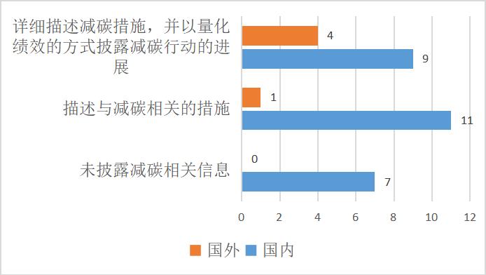 国电电力(股票代码:600795),电能实业(股票代码:00006),港灯(股票代码:02638),福能股份(股票代码:600483),华能国际电力(股票代码:600011),华润电力(股票代码:00836),长江基建(股票代码:01038),中电控股(股票代码:00002),华电国际(股票代码:01071)的可持续发展报告详细描述减碳措施,并以量化绩效的方式披露减碳行动的进展。国内外其他描述减碳行动措施的企业分布如下图所示: