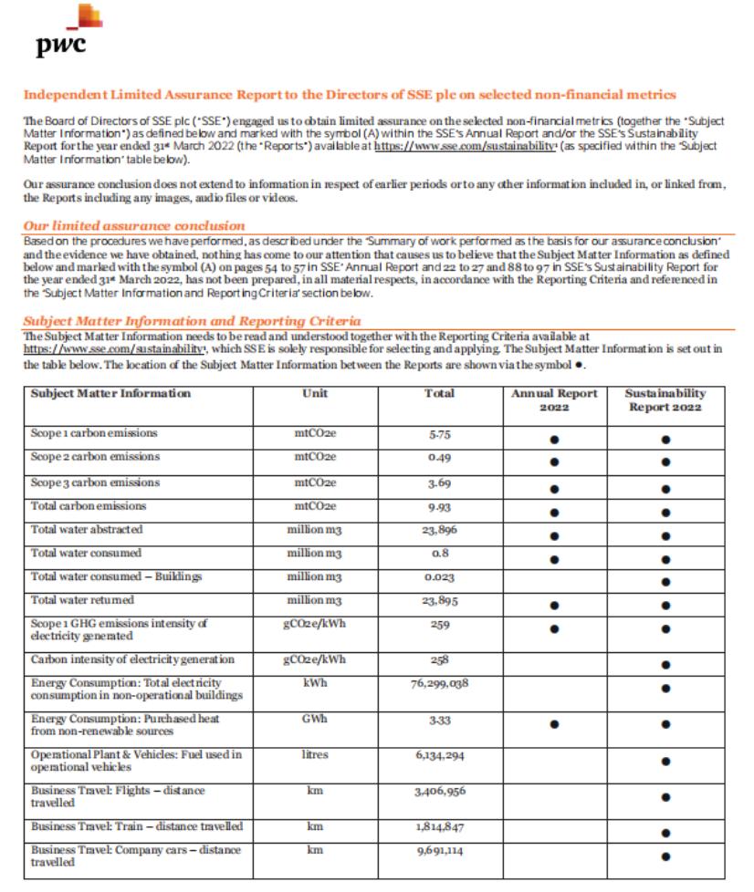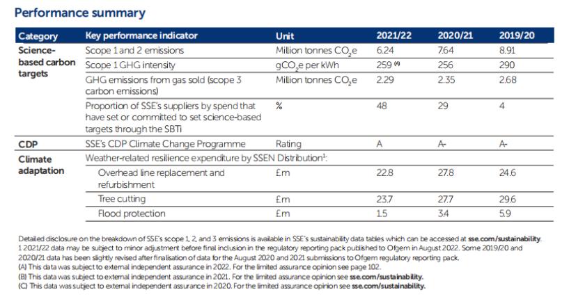 在国外,5家企业的可持续发展报告都披露了提供报告年碳排放总量或密度数据,以及范围1、2的排放数据并对数据口径等信息进行说明。以SSE(股票代码:SSEZF)为例,如下图所示: