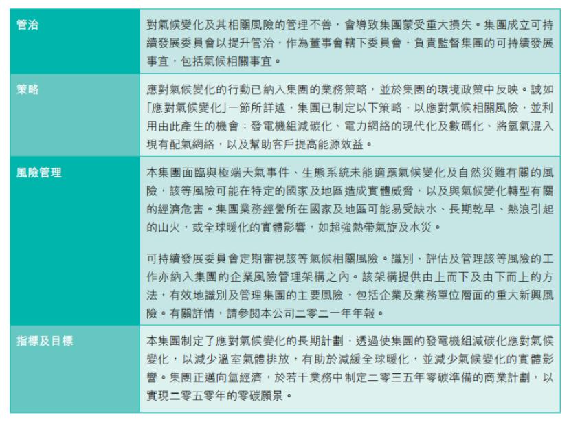 京能清洁电源(股票代码:02638),港灯(股票代码:02638),长江基建(股票代码:01038),中电控股(股票代码:00002),华润电力(股票代码:00836)的可持续发展报告提到其声明符合TCFD框架进行气候信息披露。