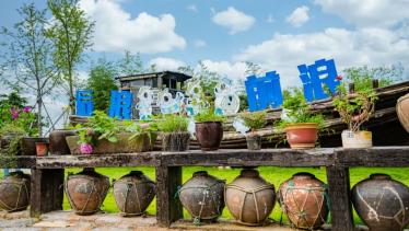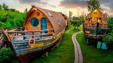 园区从2014年开始建设云过山丘海洋渔业记忆博物馆,自发的对本地海洋渔业文化进行系统梳理。收集各式大小木船50多条,收集海洋动物骨化石100多块,成立海洋渔业文化文创工坊,主题是以渔民使用的渔具展示生产过程、制作渔船模型展示海洋渔船演变过程。以海洋渔业文创产品为核心,主推渔业工坊研学教育课程,推动渔业文化的传承和发展。云过山丘将收集报废老船进行艺术化升级,改造成凸显海洋渔业特色的船坞民宿,游客可以品茶、赏景、采摘、品味正宗特色海鲜,形成了集观光、休闲、住宿、度假于一体的农旅融合新业态。船坞民宿项目是“以农促旅、以旅兴农”的农旅融合发展之路,提高了文旅附加值,实现了农、渔、旅融合发展的多重效益。“离开老船上了岸,却在梦里听见海”是云过山丘七墩八台船坞民宿的精神文化核心,民宿区建有民宿茶室、乡村音乐广场、海洋书屋、文创展厅等。