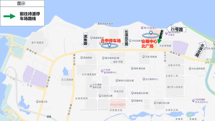 二、前往待渡停车场路线(一)椰海大道→美安大道→南海大道→盈滨大道→永庆大道→前往金沙湾待渡停车场