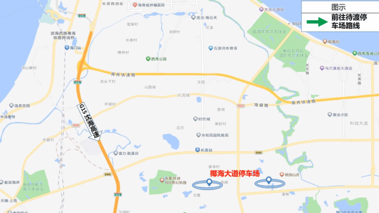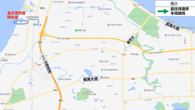 (三)金沙湾待渡车场停满后,G15高速→椰海大道停车场