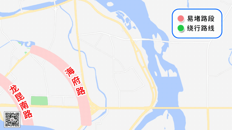 二、海府路—琼州大道、龙昆北路—龙昆南路—迎宾大道(一)可绕行文明东路、海府一横路、美祥东路、美祥横路前往滨江路往返。