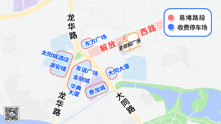 三、解放西路金棕榈广场解放西路金棕榈广场周边路段人流密集,道路狭窄,车多缓行尾部常排至龙华路。请前往解放西路商圈的市民短途步行、公交出行或将车辆停放在附近停车场后步行进入商圈,避免加重拥堵,减少个人出行不便。