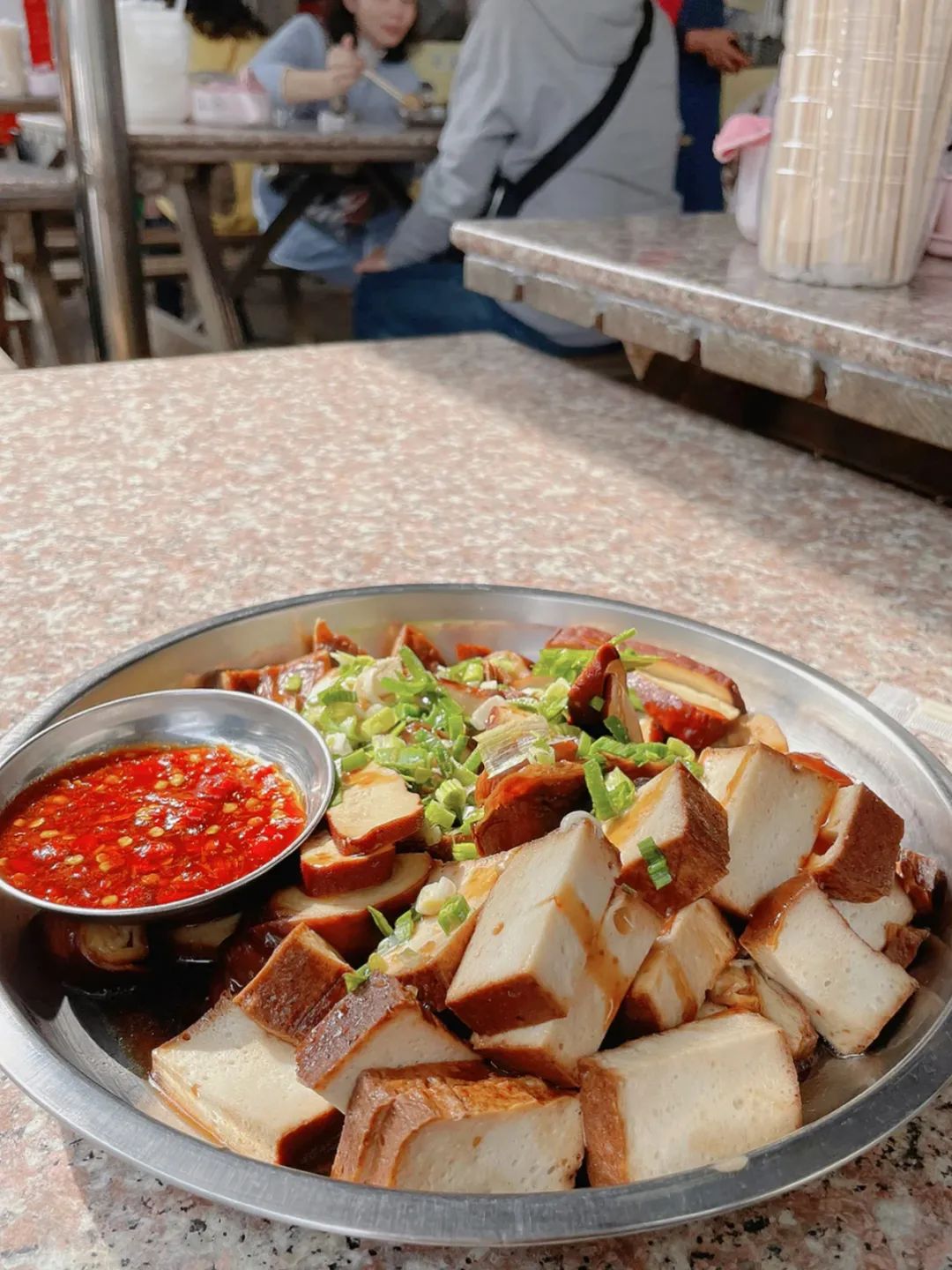 ● 藏在大溪老街的卤豆干,我愿称为世界第一然而来桃园转机的人太多了,很多人就会不止一次来桃园。当有半天左右的时间,老街几乎就成了唯一的选择。逐渐的,它们撞见了深巷里当地人才知道的、台湾独一处的三角汤圆(肉馅咸汤圆,江浙人会很熟悉),藏在菜市场隔壁的真·百年油饭(闽南油饭,很福建),老板是肌肉猛男的花生糖(问就是打糖练的),以及超无敌手作豆干卤水大拼盘(很多豆干当地才有,比如五香黑豆干)……甚至台湾极为少见的蒙古奶茶——咸的,用砖茶熬,也阴差阳错地被人发现。因为台湾几乎不产砖茶,这味道就显得弥足珍贵,需要用心行走才能发现。