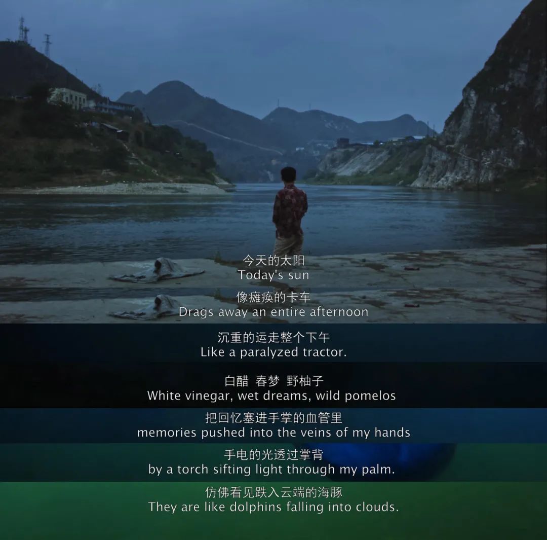 3.南方(西南)空间的“明信片”装饰倾向《宇宙》与“南方新电影”的另一共同点则是大量的诗歌作为旁白,或直接浮现于银幕的形式介入影片,作为一名二流诗人,毕赣的文字对于《路边野餐》而言恰到好处,但孔大山的诗歌在此却仅仅像一种拙劣的模仿,既未能生成水汽氤氲的南方诗意,又破坏了前二章奠定的荒诞感,导致末尾的“升华”——唐志军朗诵诗歌前的哽咽——显得过分生硬,最终硬化成一肢一节的符号僵块:无人的山境,操方言的村民以及似乎被废置又未被废置的残缺佛像。
