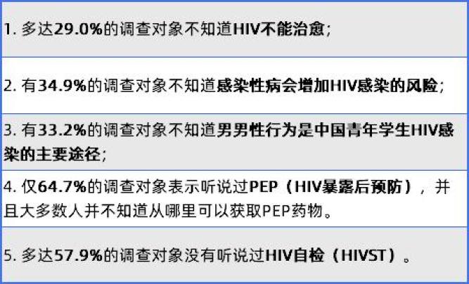 在我国,很多青少年尤其大学生群体,由于缺乏艾滋病毒相关知识,尤其是对艾滋病毒治疗、自我检测和暴露后预防知识的缺乏,酿成了终身的遗憾。